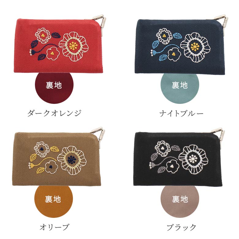 商品説明 シックなヘリンボーン織生地に大らかな花刺繍を飾りマットに輝くスパンコールをあしらったオリジナル刺繍シリーズのスマート&シンプル構造で使いやすい、がま口カードケース。